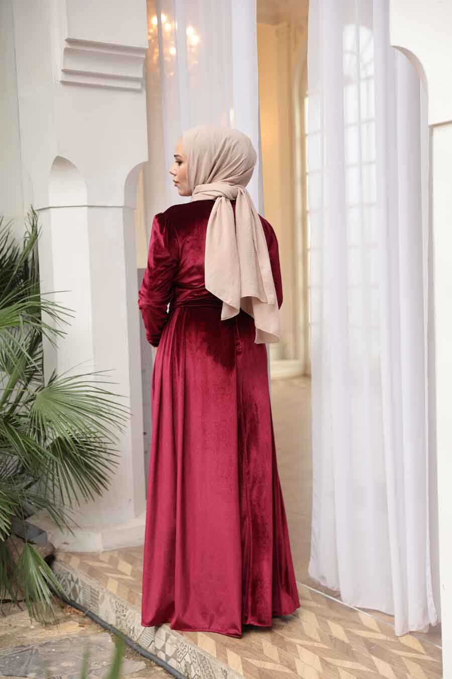 Modest Evening Dress - Tail Detail Claret Red Modest Velvet Evening Dress 57912BR