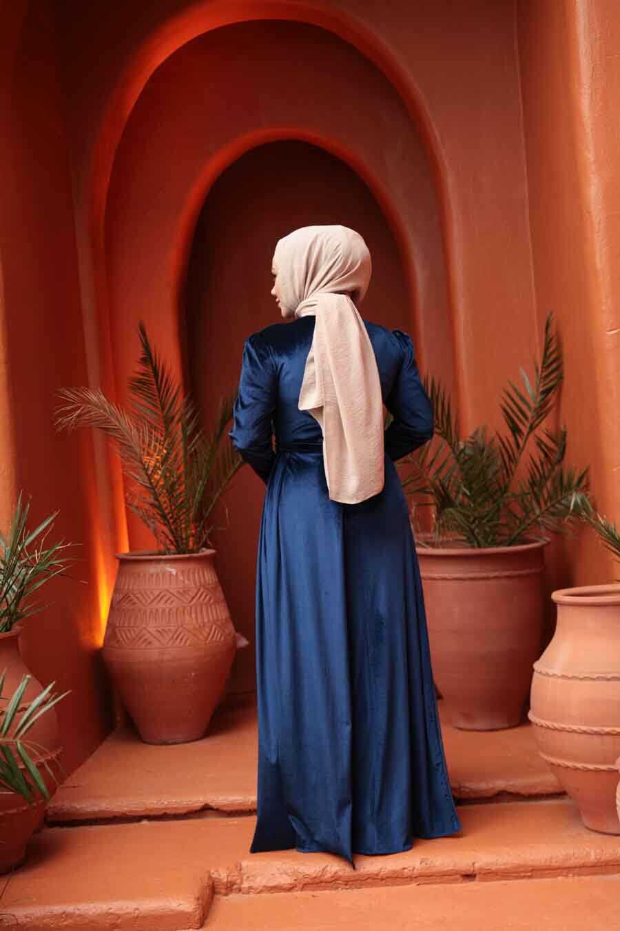 Modest Evening Dress - Tail Detail Navy Blue Modest Velvet Evening Dress 57912L