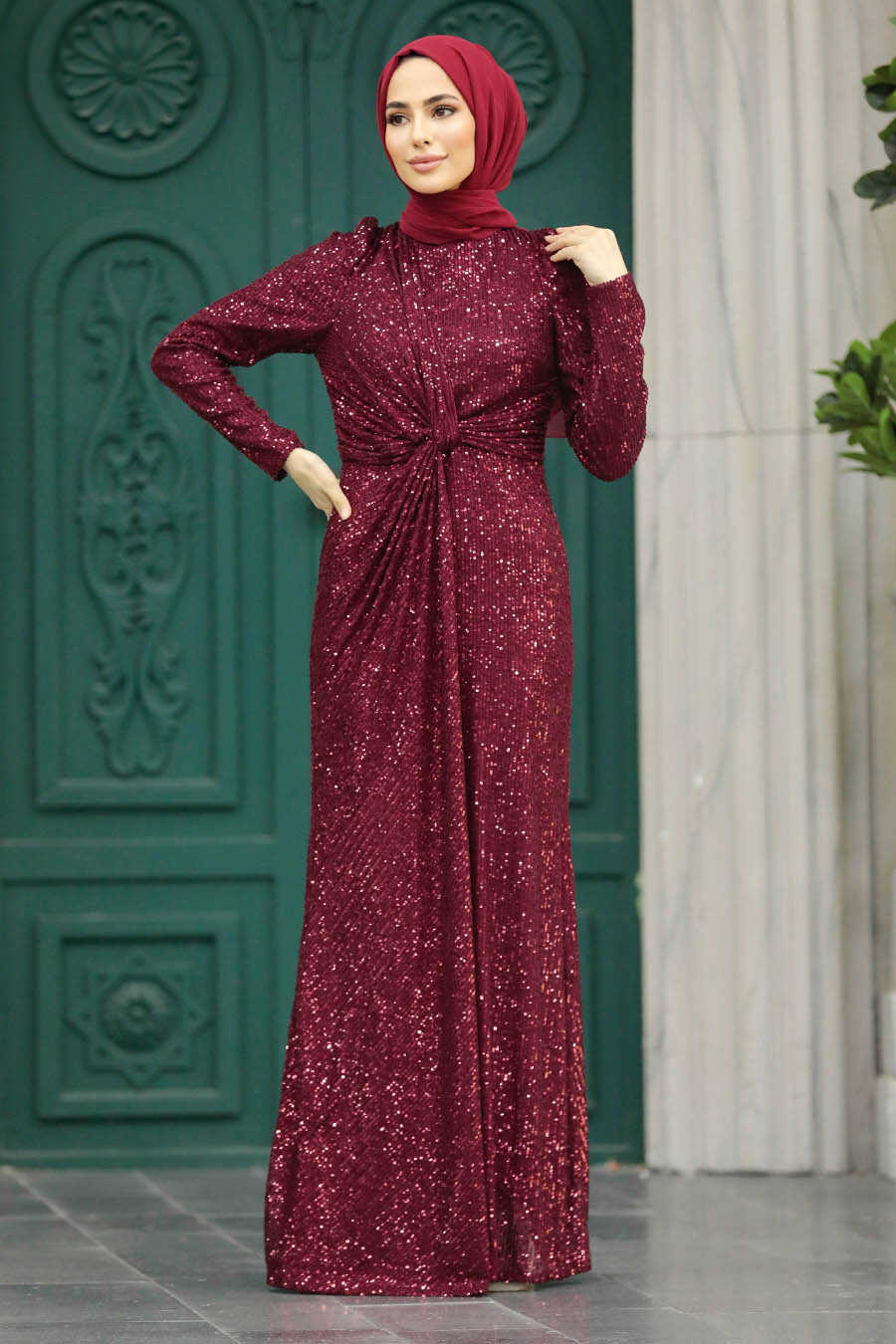 Long Claret Red Islamic Engagement Dress 40831BR