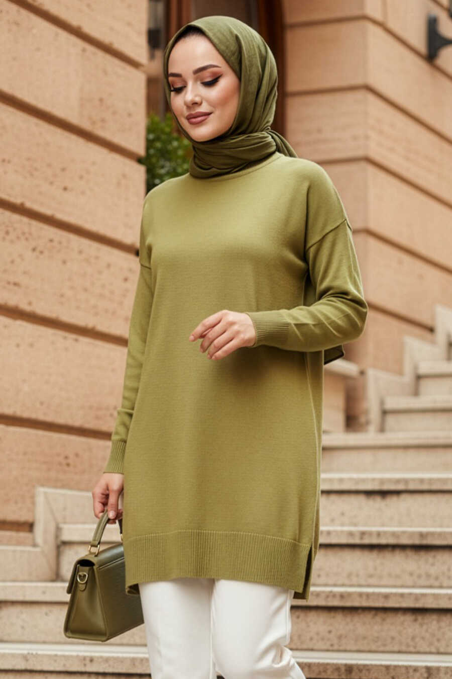 Oil Green Modest Knit Sweater Tunic 17203YY