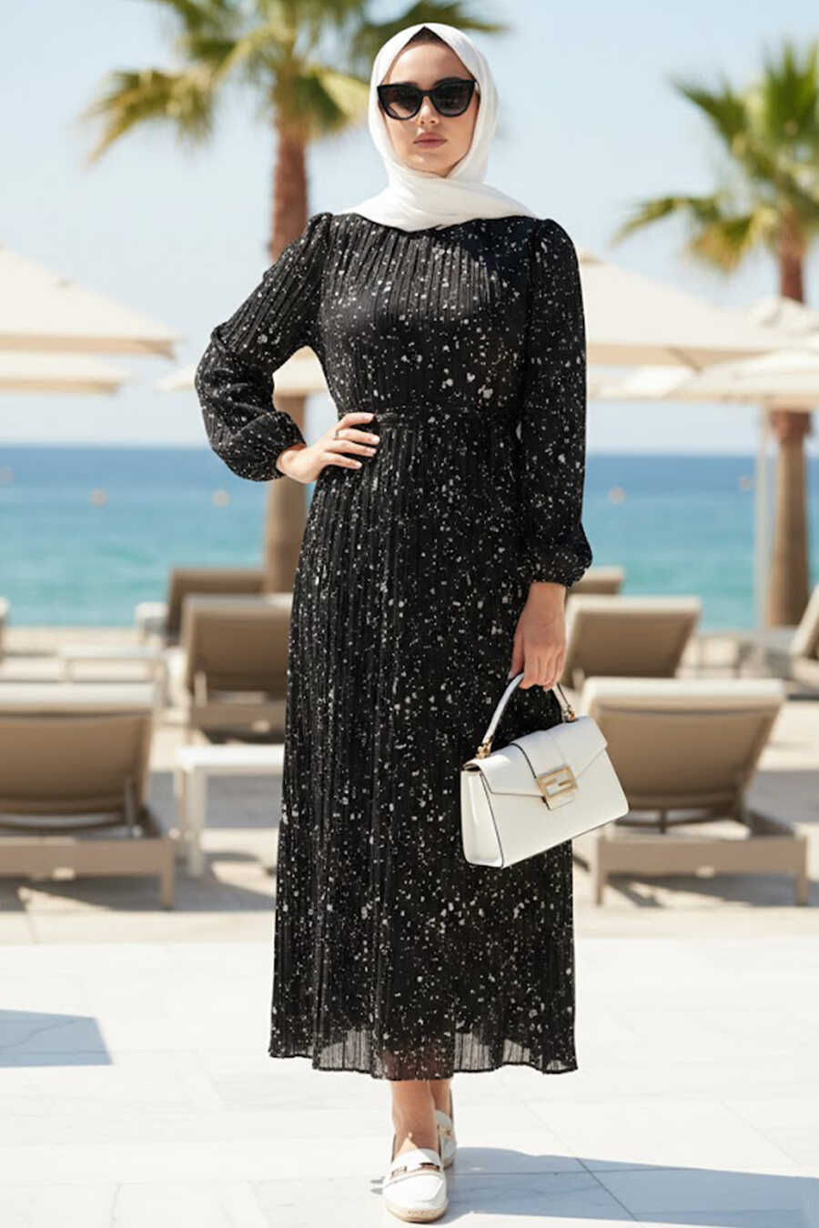 Patterned Pleated Black Modest Dress 30304S