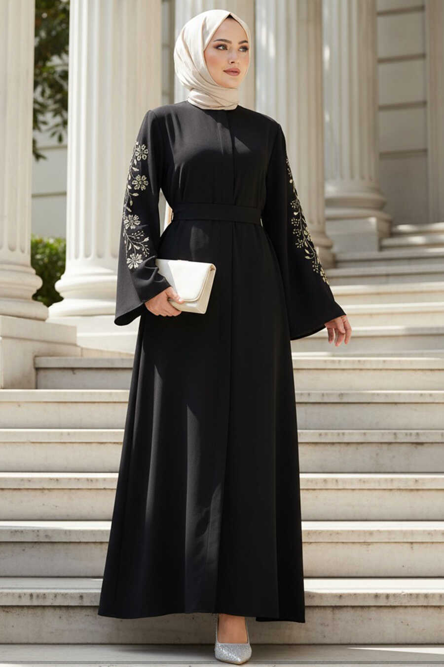 Patterned Sleeve Black Modest Abaya 60013S