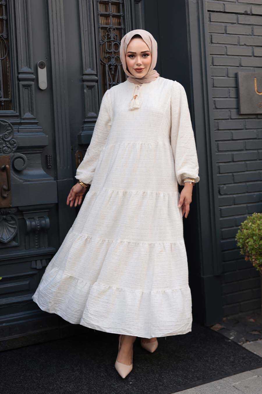 Tiered Pleated Cream Modest Dress 19046KR